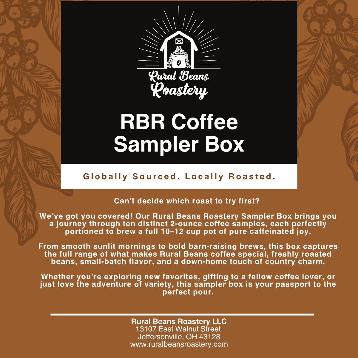 We’ve got you covered! Our Rural Beans Roastery Sampler Box brings you a journey through ten distinct 2-ounce coffee samples, each perfectly portioned to brew a full 10–12 cup pot of pure caffeinated joy.